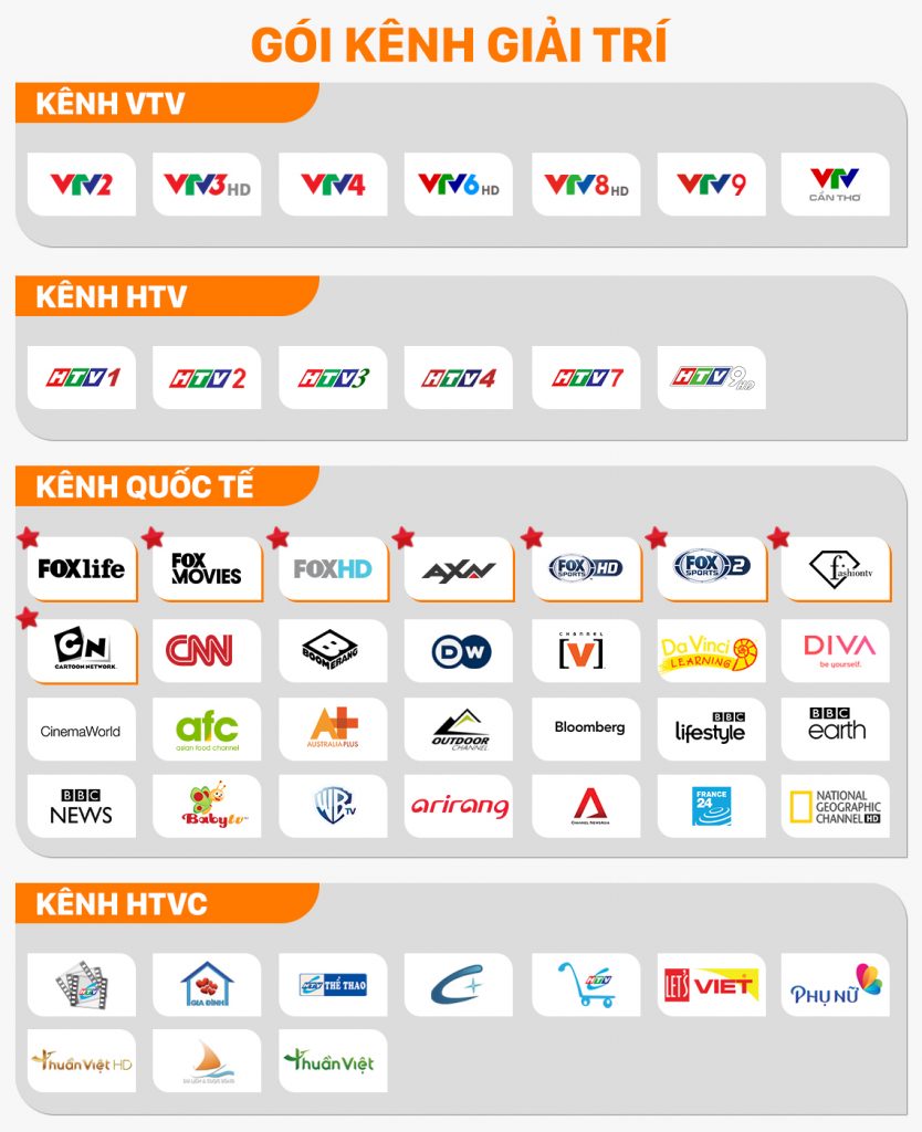 Bao gồm các kênh VTV, HTV, HTVC và các kênh quốc tế ( FOX MOVIES, AXN, DISCOVERY…)